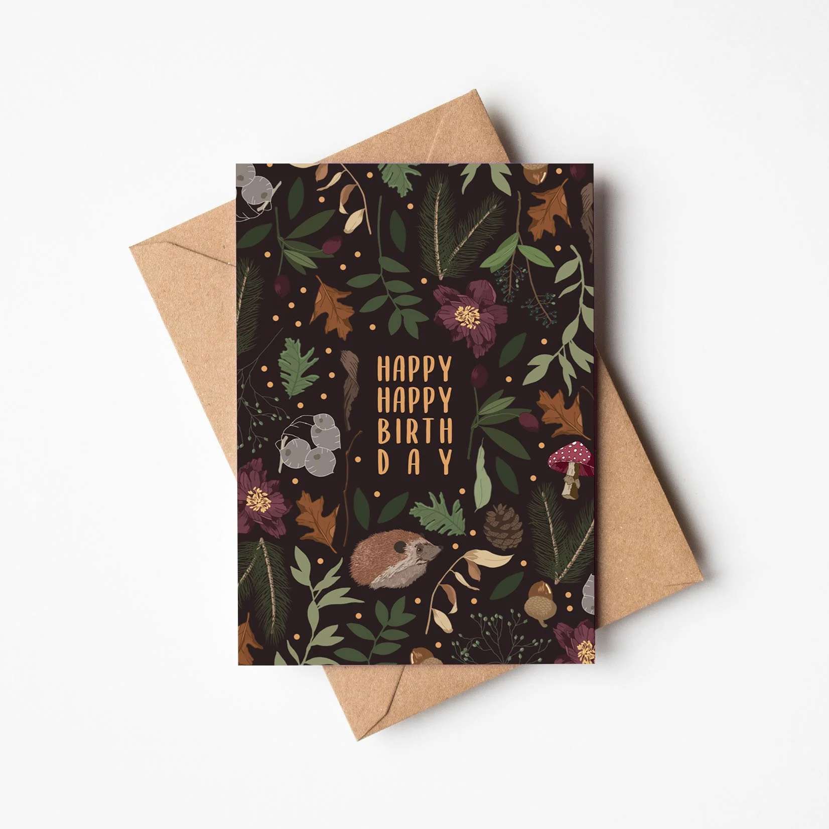 A happy birthday card featuring a beautiful illustrative all over woodland pattern, with a lovely little hedgehog and some toadstools on a dark background, perfect for an Autumn birthday.